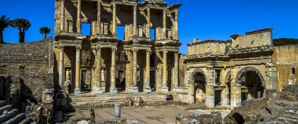 In Ephesus highlights include Double Church where in 431 the Third Ecumenical Council was held, the Library of Celcus, the Temple of Hadrian, the Fountain of Trajan and the Theatre for many Christians the best-known building in Ephesus where a 1st century AD silversmith attempted to stir up a riot to get rid of St. Paul who was damaging his business of making images of Artemis.